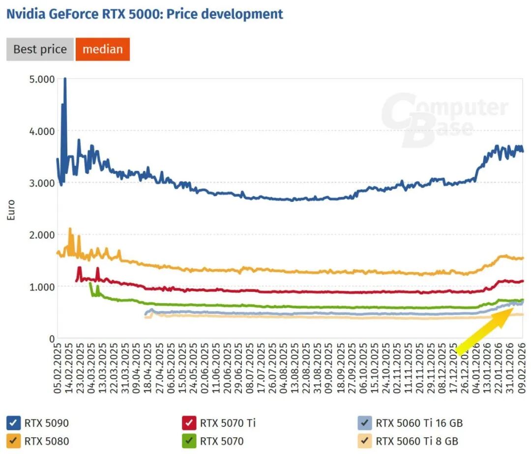 Meanwhile, the market performance of the current RTX 50 series graphics cards presents an intriguing trend. According to market tracking data, while most models stabilized or even saw slight price declines after weeks of increases in January, the mid-range RTX 5060 Ti 16GB has shown unusually strong price resilience. Its daily median price has repeatedly exceeded 700 euros (approximately 5,757 yuan), approaching the higher-tier RTX 5070 and breaking the conventional price gap of around 100 euros. Although the lowest price of the RTX 5060 Ti 16GB remains at around 550 euros—still a significant difference from the RTX 5070 12GB's 650 euros—such high-value stock tends to sell out almost instantly.